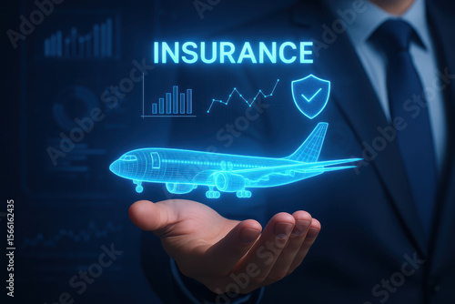 Airplane insurance concept with holographic aircraft and shield icon floating above hand showing protection and security in aviation industry with digital data charts