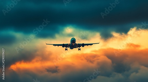 Airplane landing through dramatic sunset clouds.
