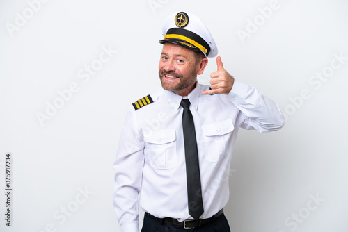 Airplane middle age pilot isolated on white background making phone gesture. Call me back sign