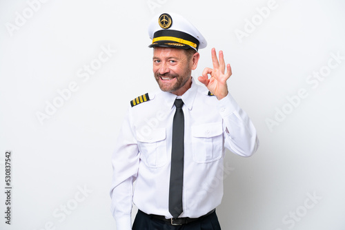 Airplane middle age pilot isolated on white background showing ok sign with fingers