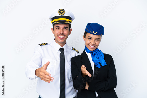 Airplane pilot and mixed race air hostess isolated on white background shaking hands for closing a good deal