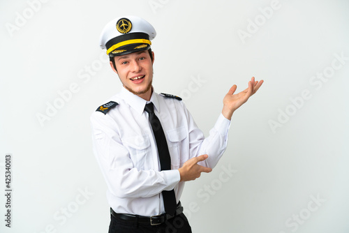 Airplane Russian pilot isolated on white background extending hands to the side for inviting to come