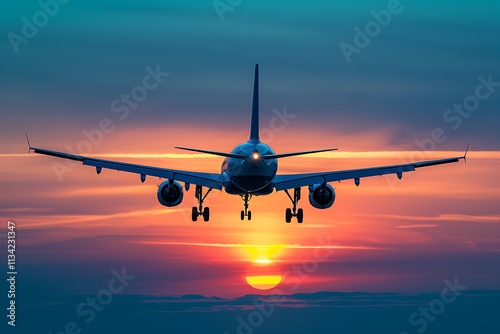 Airplane silhouette at sunset sky background.