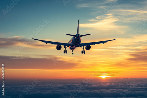Airplane silhouette at sunset with vibrant sky creating a peaceful atmosphere