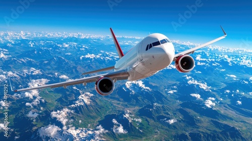 Airplane soaring high above breathtaking mountain landscapes and fluffy clouds during a clear day