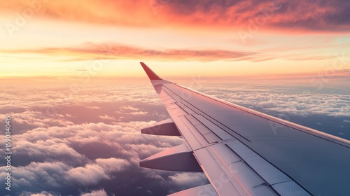 Airplane wing in close-up, against a beautiful sky, generative ai