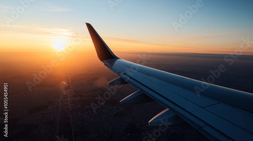 Airplane wing viewed from window during sunset, overlooking cityscape and horizon with gradient sky colors