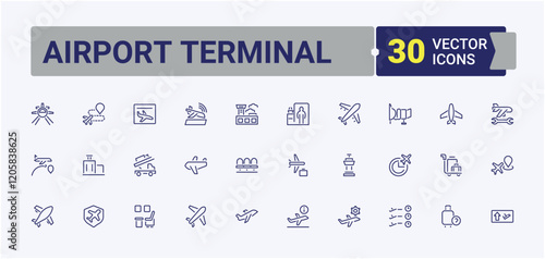 Airport Terminal icon set. Related to transportation, waiting, ticket, transport, tourism, elevator and more. Collection for mobile and web apps. Editable stroke.