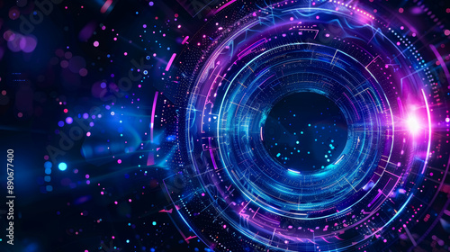 Airy digital blue and purple tech circle on dark background. Science, futuristic digital technologies concept.