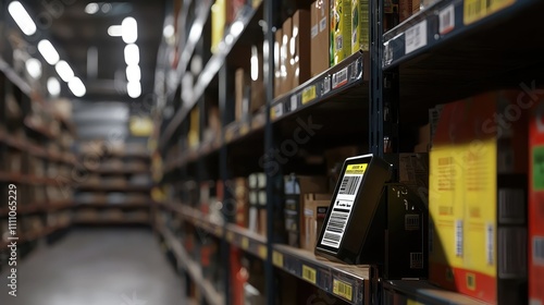 Aisle of a Modern Warehouse Filled with Boxes and Storage Shelves, Highlighting Organized Inventory Management in a Commercial Setting