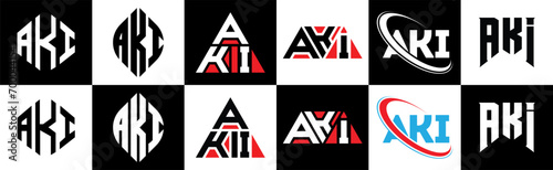 AKI letter logo design in six style. AKI polygon, circle, triangle, hexagon, flat and simple style with black and white color variation letter logo set in one artboard. AKI minimalist and classic logo