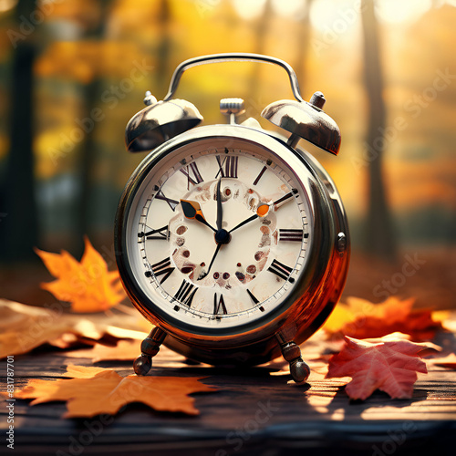 alarm clock autumn winter Concept, daylight saving time. Sommer time, winter time, changeover, switch of time. Sommer or winter time. Clock as a timer for celebrations. Autumnal forest generate ai