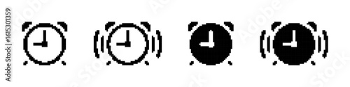Alarm clock pixel icons set. Ringing alarm clock on white background. Pixel art.