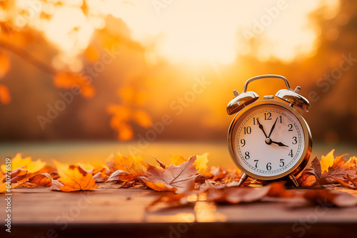 Alarm clock rests on autumn leaves against a backdrop of natural scenery