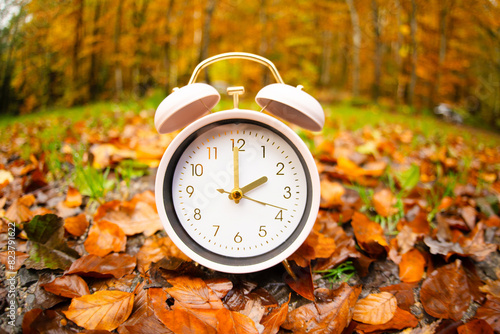 Alarm clock with autumn foliage, end of daylight saving time in fall, winter time changeover