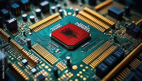 Albania flag on a processor, CPU or microchip on a motherboard. Concept for the battle of global microchips production.