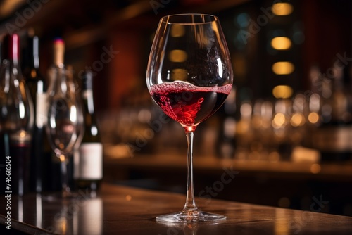 alcohol, bar, glasses, wine, drink, celebration, beverage, liquid, alcoholic, background. close up photo glass wine red. romantic luxury vibe with bokeh light night club background by AI generative.