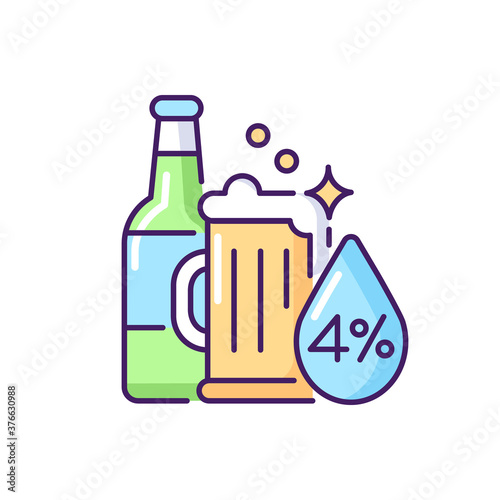 Alcohol RGB color icon. Beverage in bottle. Spirit with alcoholic percent. Beer glass. Drink in mug. Pub menu. Bar product. Whiskey and vodka. Unhealthy food. Isolated vector illustration