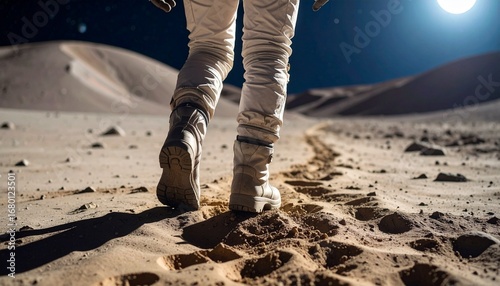 Alien leaving new footprints on dusty moon surface, distant space background, 8K detail