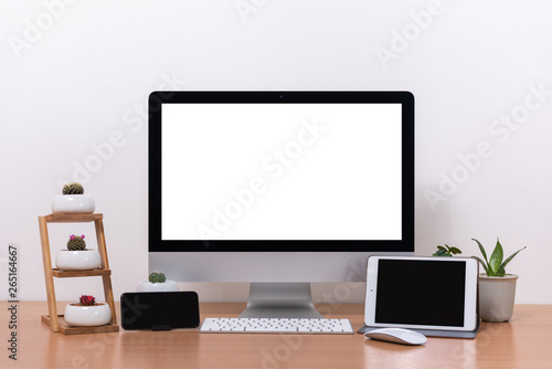 All in one computer, mouse, keyboard, smart phone, tablet, cactus pots and plant vase on wooden table