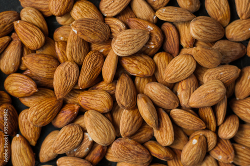 Almond close-up on a black background. Different angles of popular tree nuts, healthy and nutritious ingredient. Almond in a black pan high angle view on a white wooden background