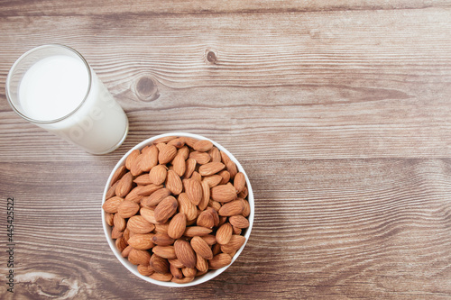 Almond nuts in a white bowl and milk in glass on wooden background, top view, flat lay, top-down, selective focus.copy space.