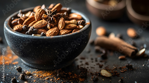 Almonds and spices in a bowl. Close-up of nuts and aromatic ingredients.
