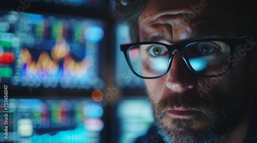 Alone in the office at night, the financial analyst remains anchored to his desk, engaged in the meticulous examination of market trends and data anomalies.