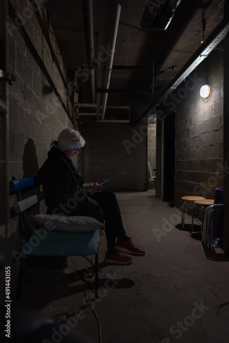 Alone woman is sitting on a bench and reading a war news in a bombproof shelter