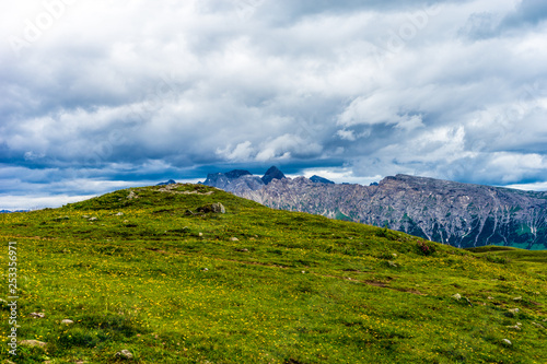 Alpe di Siusi, Seiser Alm with Sassolungo Langkofel Dolomite, a large green field with a mountain in the background