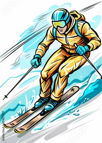 Alpine Adventure: A Dynamic Depiction of Downhill Skiing, ideal for use in winter sports publications, ski resort advertisements, educational materials about skiing techniques, or promotional content