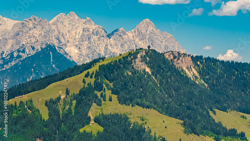 Alpine summer view with the Jacob cross and the Loferer Steinberge mountains in the background at Mount Streuboeden, Fieberbrunn, Kitzbuehel, Tyrol, Austria