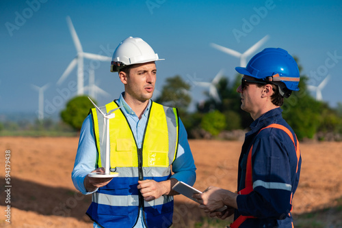 Alternative renewable energy and system service, Technician engineer inspection work at wind turbine electricity industrial, green technology for environment by using windmill in power generator farm