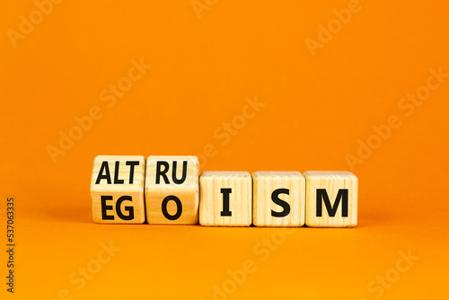 Altruism or egoism symbol. Concept words Egoism and Altruism on wooden cubes. Beautiful orange table orange background. Business psychological altruism or egoism concept. Copy space