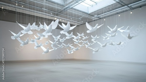 Always loved and remembered. Art installation featuring suspended white birds in minimalist space.