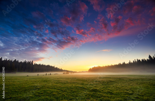 Amaizing sunrise view on Durmitor mountains, National Park, Mediterranean, village Zabljak, Montenegro, Balkans, Europe. Strange misty pasture in the sunlight. Bright summer view on alpine valley.
