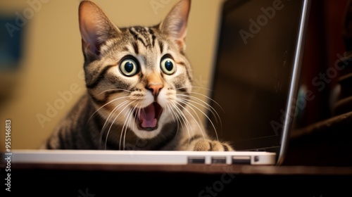 Amazed kitten looking at a laptop, isolated on white background. Neural network ai generated art