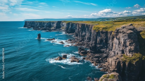 Amazing coastal landscape with steep cliffs overlooking the deep blue ocean, waves crashing against the rocks under a clear bright sky