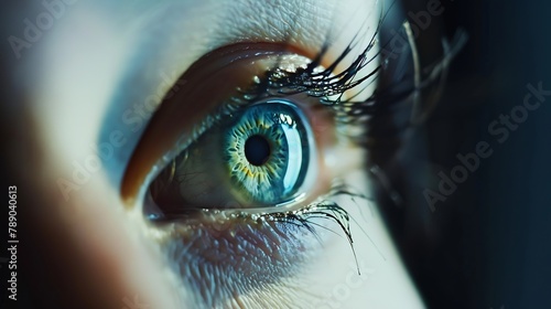 Amazing female blue and green colored wide opened eye in low light technique closeup : Generative AI