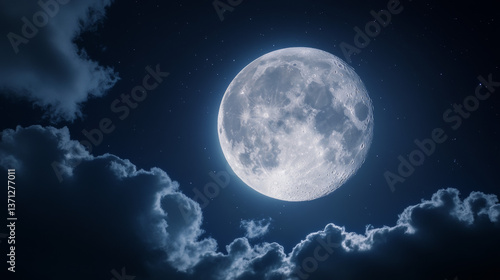 Amazing scenery of white glowing moon with craters in black sky with clouds at night