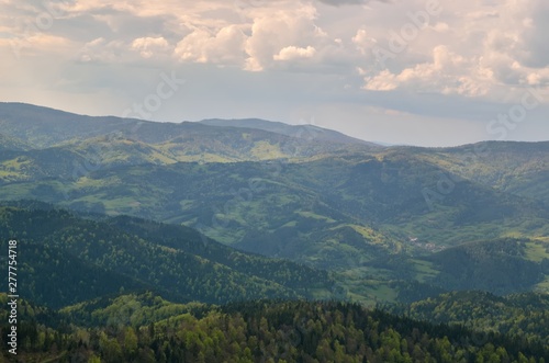 Amazing spring mountain landscape. Fairytale green hills in the countryside.