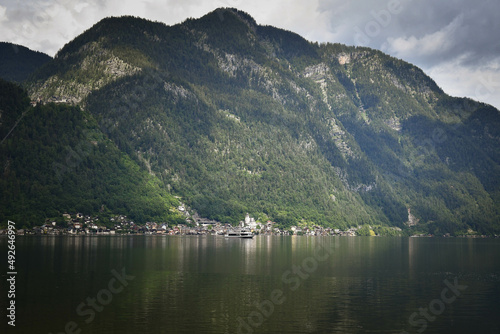Amazing summer nature of Gosausee (Vorderer) lake with Dachstein glacieron background. Beauty of nature concept background.