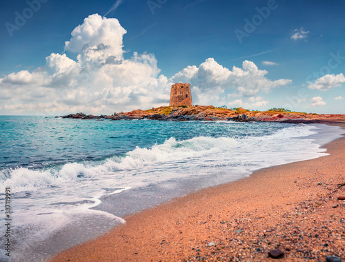 Amazing summer view of Torre di Bari tower. Gloomy morning scene of Sardinia island, Italy, Europe. Beautiful seascape of Mediterranean sea. Traveling concept background..