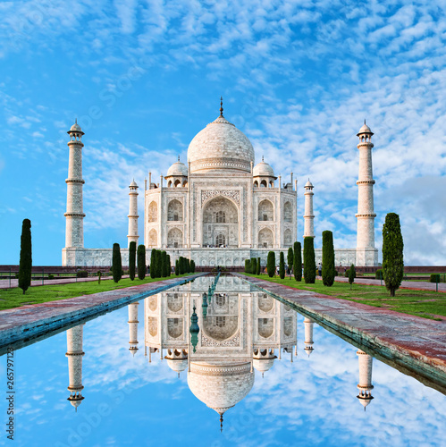 Amazing view on the Taj Mahal in sunset light with reflection in water. The Taj Mahal is an ivory-white marble mausoleum on the south bank of the Yamuna river. Agra, Uttar Pradesh, India.
