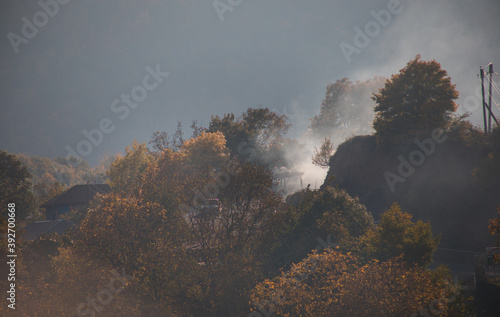 Amazing view with colorful autumn forest with asphalt mountain road at sunset. Beautiful landscape with empty road, trees and sunlight in the evening in autumn. Travel background. Nature