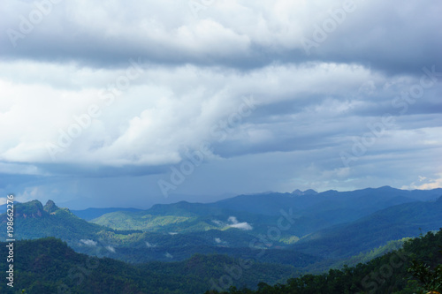 Amazing wild nature view of layer of mountain forest landscape with cloudy sky at winter season. Natural green scenery of cloud and mountain slopes background.