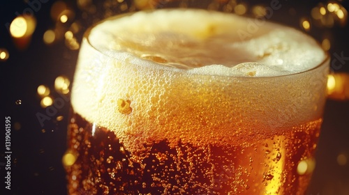 Amber Beer Cascades Gushing Over the Glass Creating Bubble Overflow