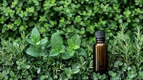 Amber bottle of essential oil nestled among fresh mint and herbs