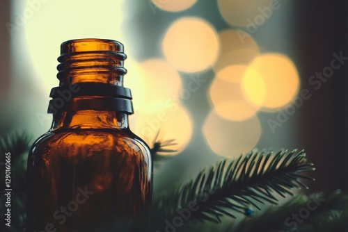 Amber Glass Bottle with Bokeh Background and Pine Branches