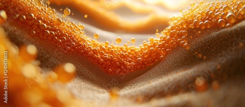 Amber spheres flowing on textured surface, backlit, abstract background, cosmetic ad